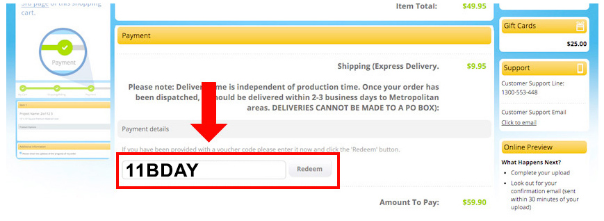On the "Payment" page you will see a Voucher Code field. Enter the code 11BDAY in the field and click Redeem. This will reduce the cost of your order by the corresponding amount above.