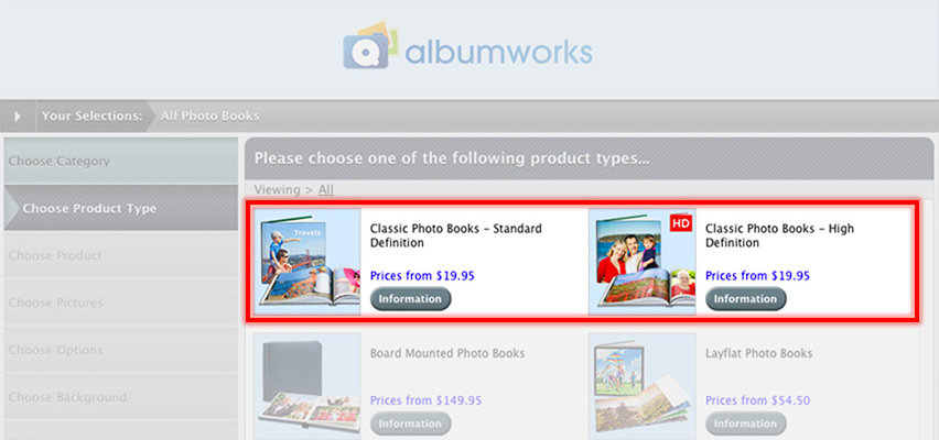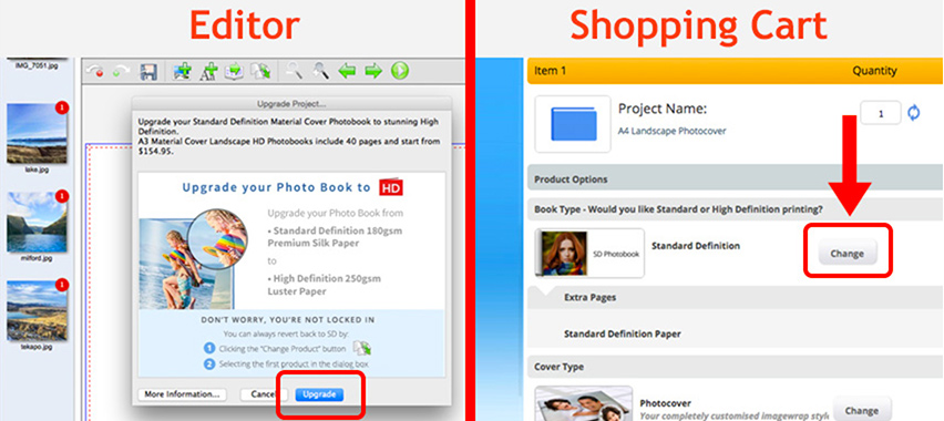 If you create and Standard Definition book, you can upgrade to High Definition in the Editor or Shopping cart when prompted. Or alternatively if you have started a High Definition book, simply continue with your order.