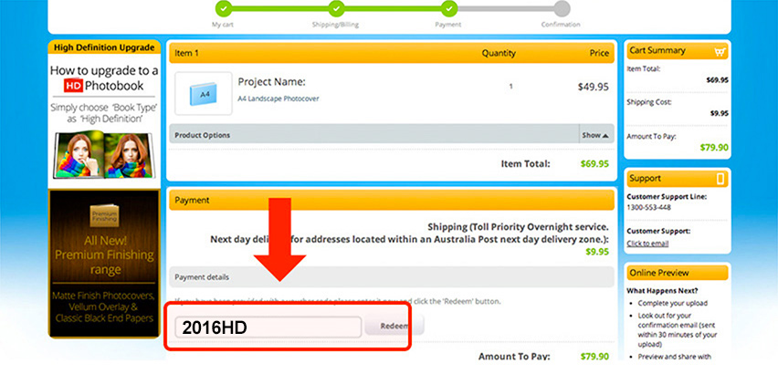 On the Payment page you will see a 'Voucher Code' field. Enter the code (2016HD) in the field and click Redeem. This will deduct your total to the base price of a Standard Definition Photo Book. Any additional pages will be charged at the selected HD amount.
