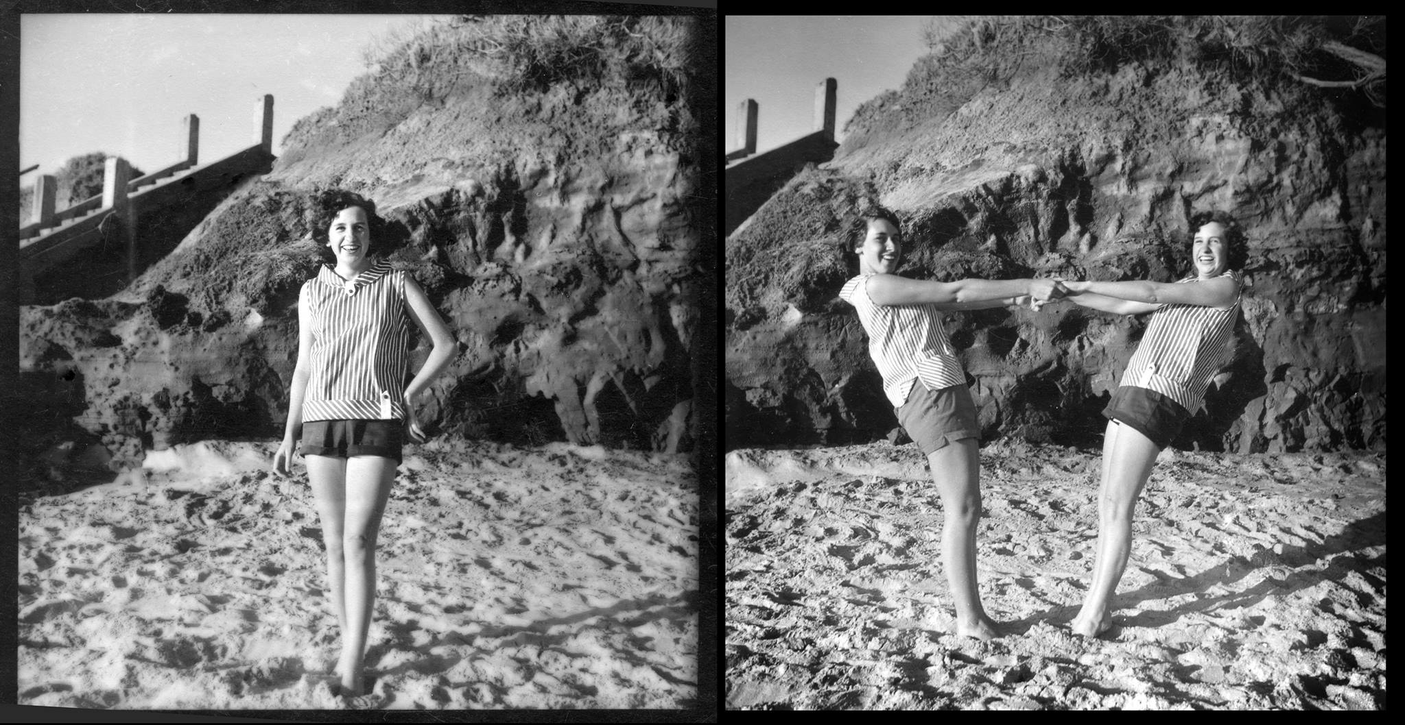 "1958 at Frankston beach - My mum and her older sister having some fun in front of the camera!"