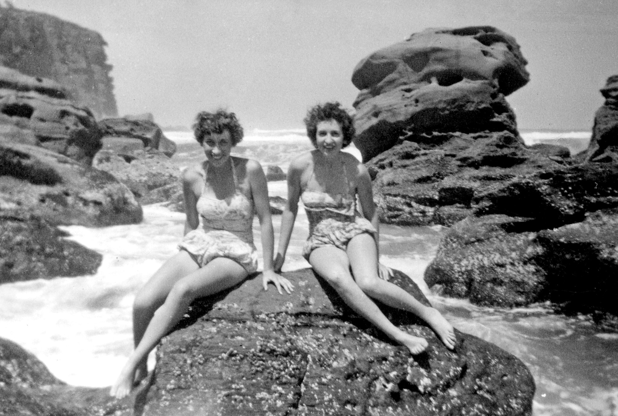 "Beach babes in bathing suits they made themselves - My mum and her older sister on the rocks at Newcastle in 1959."