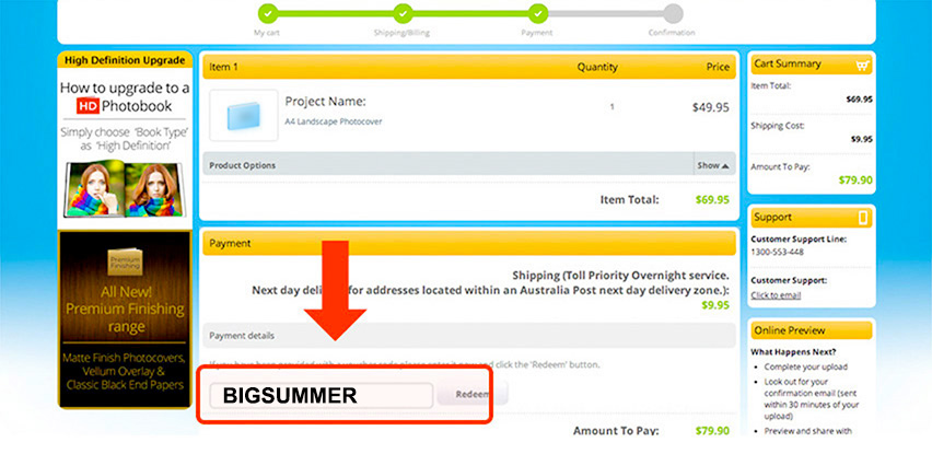 On the Payment page you will see a Voucher Code field. Enter the code BIGSUMMER in the field and click Redeem. This will apply a 35% discount to the base price of your Photo Book!