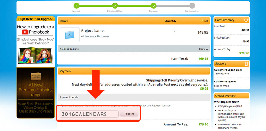 4. On the Payment Page of the shopping cart, enter the following Voucher Code: 2016CALENDARS