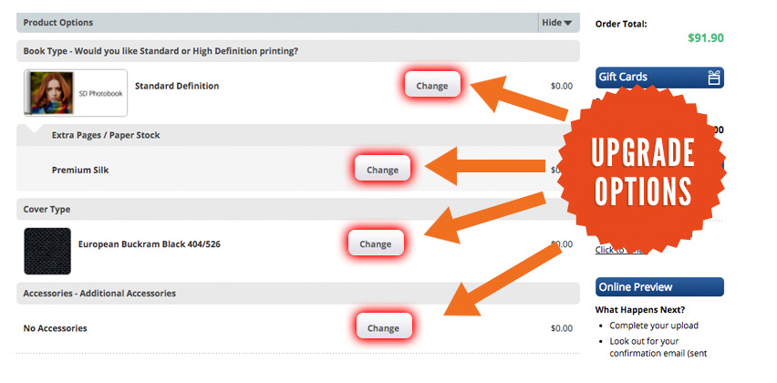 Once in the Shopping Cart you can add any additional features, or upgrade to HD if you’re making a Classic Photo Book. Remember, if your product total is greater than $150, you’ll save 40%!