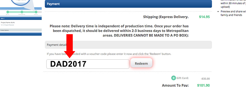 On the Payment page you will see a 'Voucher Code' field. Enter the code (DAD2017) in the field and click Redeem. This will deduct the cost of the additional pages from your total price.