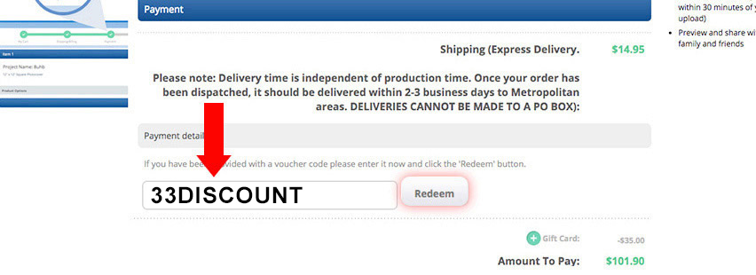 On the "Payment" page you will see a Voucher Code field. Enter the code 33DISCOUNT in the field and click Redeem. This will reduce the combined cost of your product(s) and shipping by 33%.