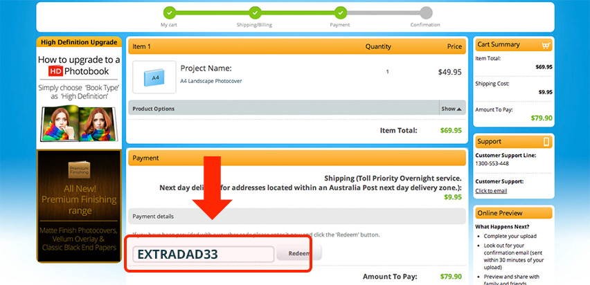 On the Payment page you will see a 'Voucher Code' field. Enter the code (EXTRADAD33) in the field and click Redeem. This will deduct the cost of the additional pages from your total price.