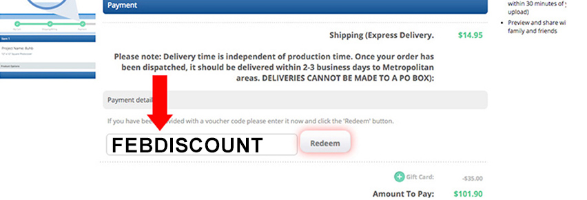 On the "Payment" page you will see a Voucher Code field. Enter the code FEBDISCOUNT in the field and click Redeem. This will reduce the cost of your order by the corresponding discount shown at the top of this page.