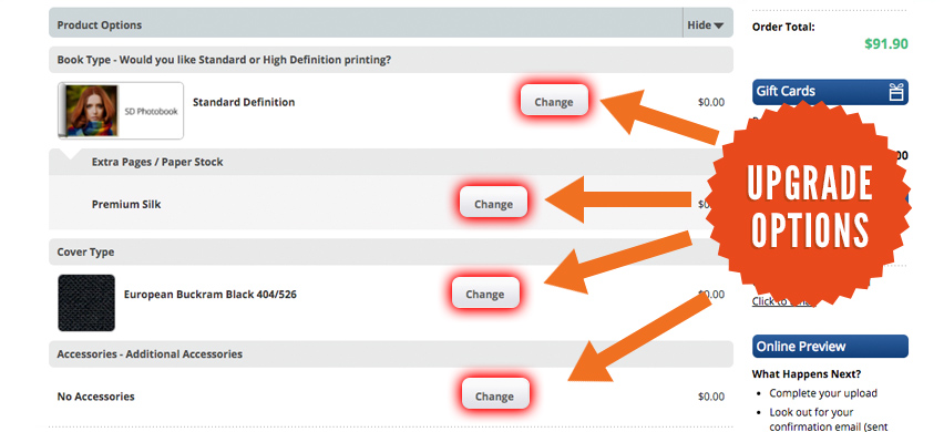 Once in the Shopping Cart you can add any additional features, or upgrade to HD if your making a Classic Photo Book. Remember, if your product total is greater than $149, you’ll save 46%!
