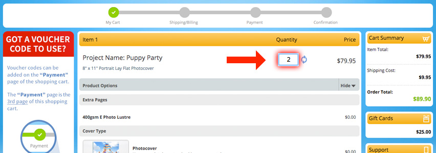 You will need to update your order quantity and click the refresh button to reflect how many Photo Books you wish to order. Change quantity to 2 to receive 1 copy free. Change your quality to 4 to receive 2 copies free. Books must be ordered in multiples of “2” to receive free copies.