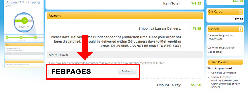 To receive your 40 extra pages for free, you must apply the voucher code FEBPAGES on the 'Payment' page in the Shopping Cart.