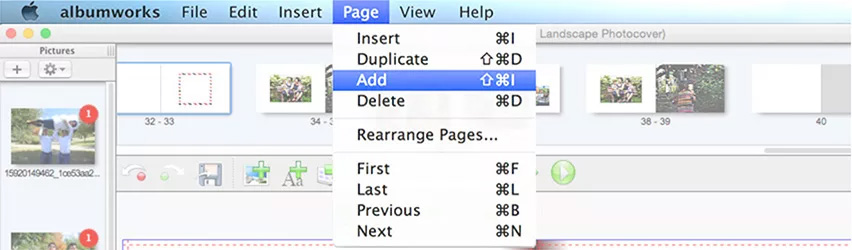 To add extra pages to your album, click on the 'Page' menu in the top menu bar, then click 'Add'. This will add an minimum of two pages before the last page of the album.