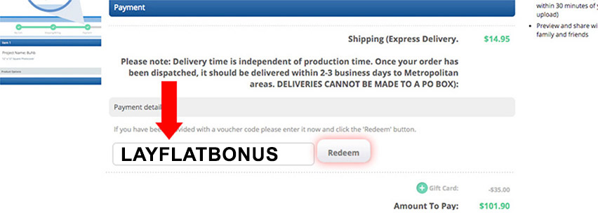 On the Payment page you will see a 'Voucher Code' field. Enter the code (LAYFLATBONUS) in the field and click Redeem. This will deduct the cost of the additional pages and Slip Case from your total price.