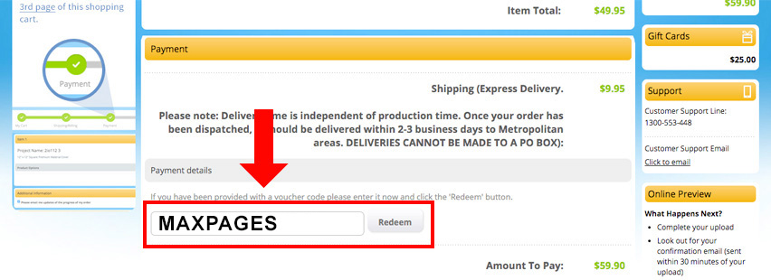 On the Payment page you will see a 'Voucher Code' field. Enter the code (MAXPAGES) in the field and click Redeem. Your discount will then be applied!