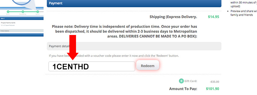On the Payment page you will see a 'Voucher Code' field. Enter the code (1CENTHD) in the field and click Redeem. This will deduct your total to the price of a Standard Definition Photo Book + $0.01.