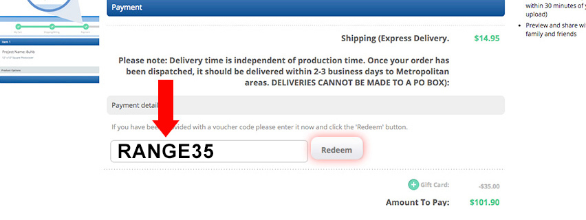 On the "Payment" page you will see a Voucher Code field. Enter the code RANGE35 in the field and click Redeem. This will reduce the cost of your product by 35%.