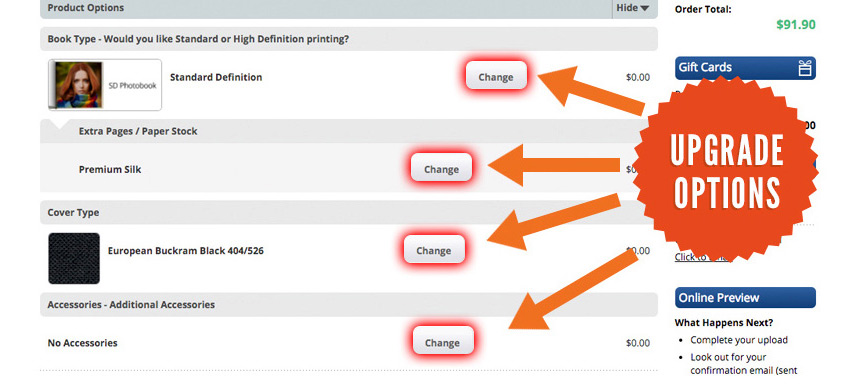 Once in the Shopping Cart you can add any additional features, or upgrade to HD if you’re making a Classic Photo Book. Remember, if your product total is greater than $175, you’ll save 44%!