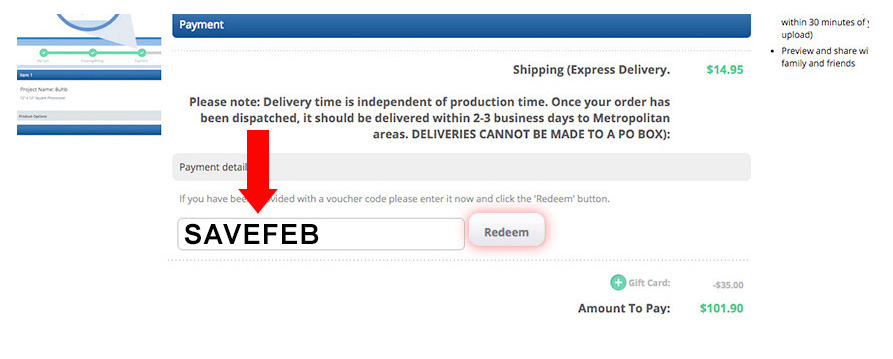On the "Payment" page you will see a Voucher Code field. Enter the code SAVEFEB in the field and click Redeem. This will reduce the cost of your order by the corresponding discount shown at the top of this page.