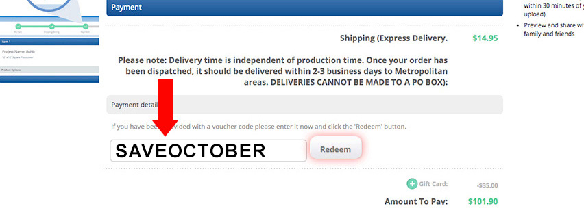 On the "Payment" page you will see a Voucher Code field. Enter the code SAVEOCTOBER in the field and click Redeem. This will reduce the cost of your order by the corresponding discount shown at the top of this page.