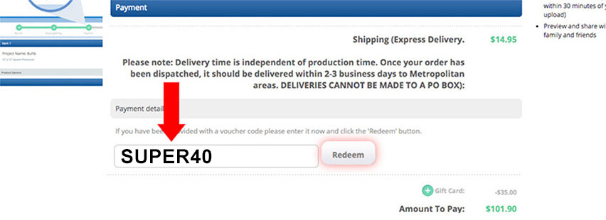 On the Payment page you will see a 'Voucher Code' field. Enter the code (SUPER40) in the field and click Redeem. This will deduct the cost of the additional pages from your total price.