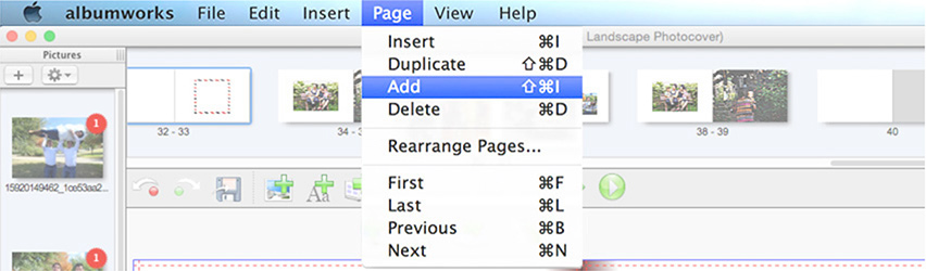 To add extra pages to your Photo Book, click on the 'Page' menu in the top menu bar, then click 'Add'. This will add an minimum of two pages* before the last page of the album.