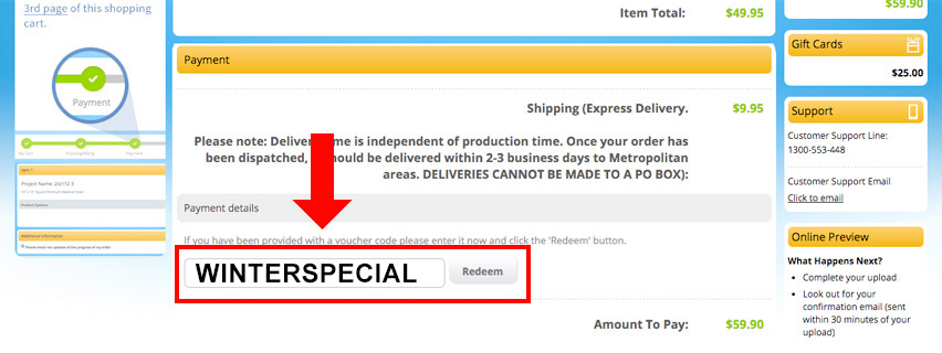 On the Payment page you will see a 'Voucher Code' field. Enter the code (WINTERSPECIAL) in the field and click Redeem. This will deduct the cost of the additional pages from your total price.