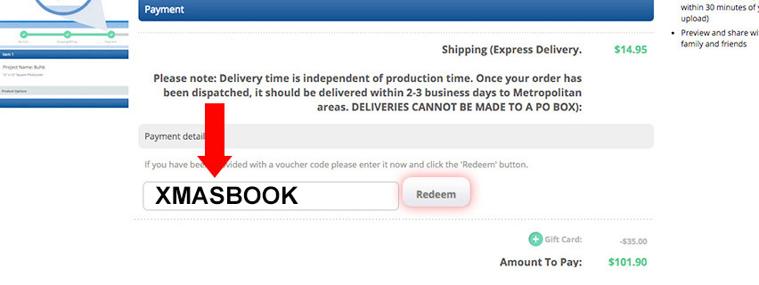 Enter the voucher code XMASBOOK on the Payment page of the Shopping Cart. The Payment page is the third page of the Cart. You must complete the My Cart and Shopping/Billing pages first.