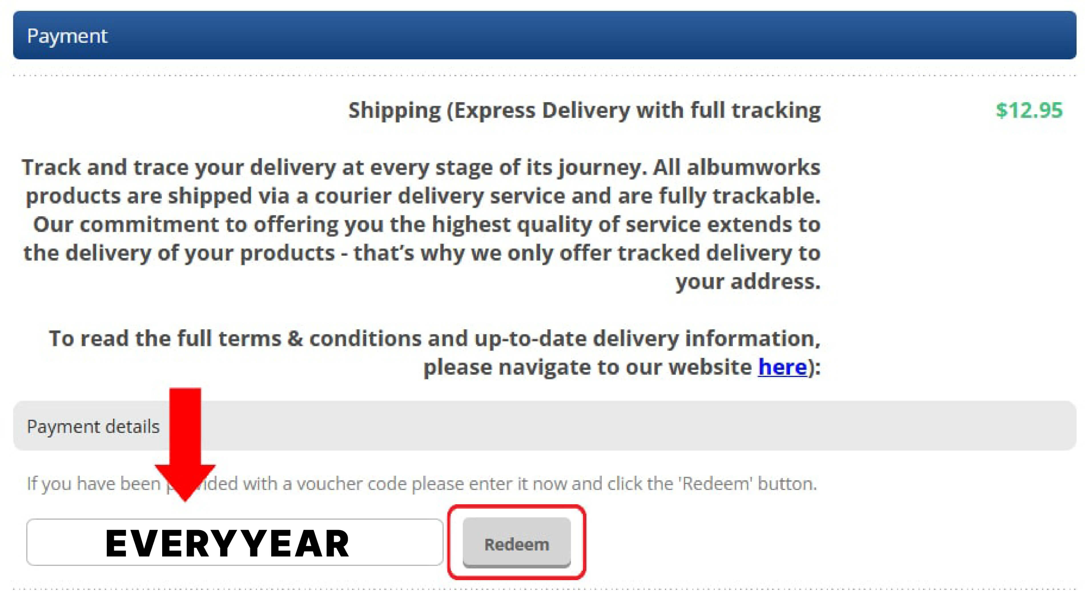 Enter the Voucher Code EVERYYEAR on the Payment page of the Shopping Cart. The "Payment" page is the third page of the Cart. You must complete the "My Cart" and "Shipping/Billing" pages first